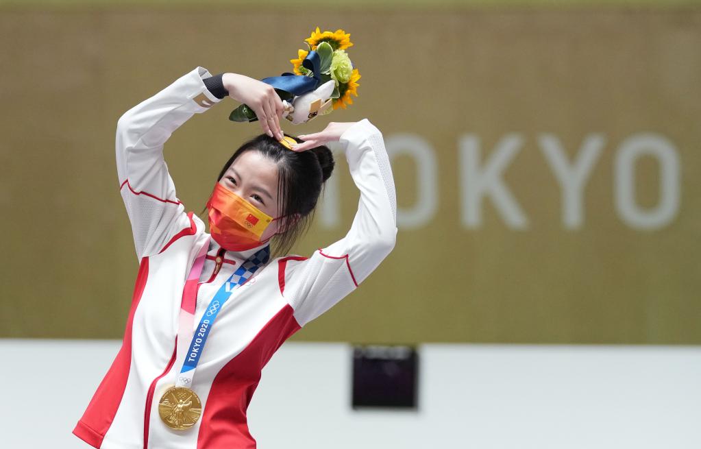 Gold medalist Yang Qian of China gestures during the awarding ceremony for the women's 10m air rifle event at the Tokyo 2020 Olympic Games in Tokyo, Japan, July 24, 2021. (Xinhua/Ju Huanzong)