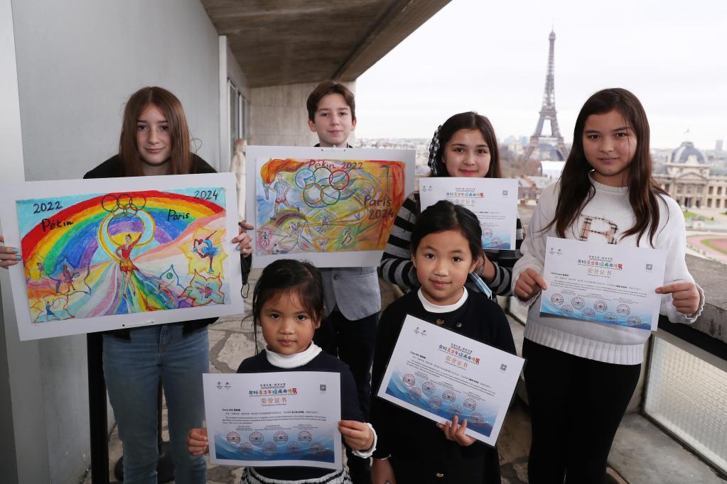 Children show their paintings and participation certificates of the "Colourful Imagination of Ice and Snow, Best Wishes for the Winter Olympics-International Youth Painting Invitational Exhibition" at the headquaters of the United Nations Educational, Scientific and Cultural Organization (UNESCO) in Paris, France, Dec. 15, 2021. (Xinhua/Gao Jing)