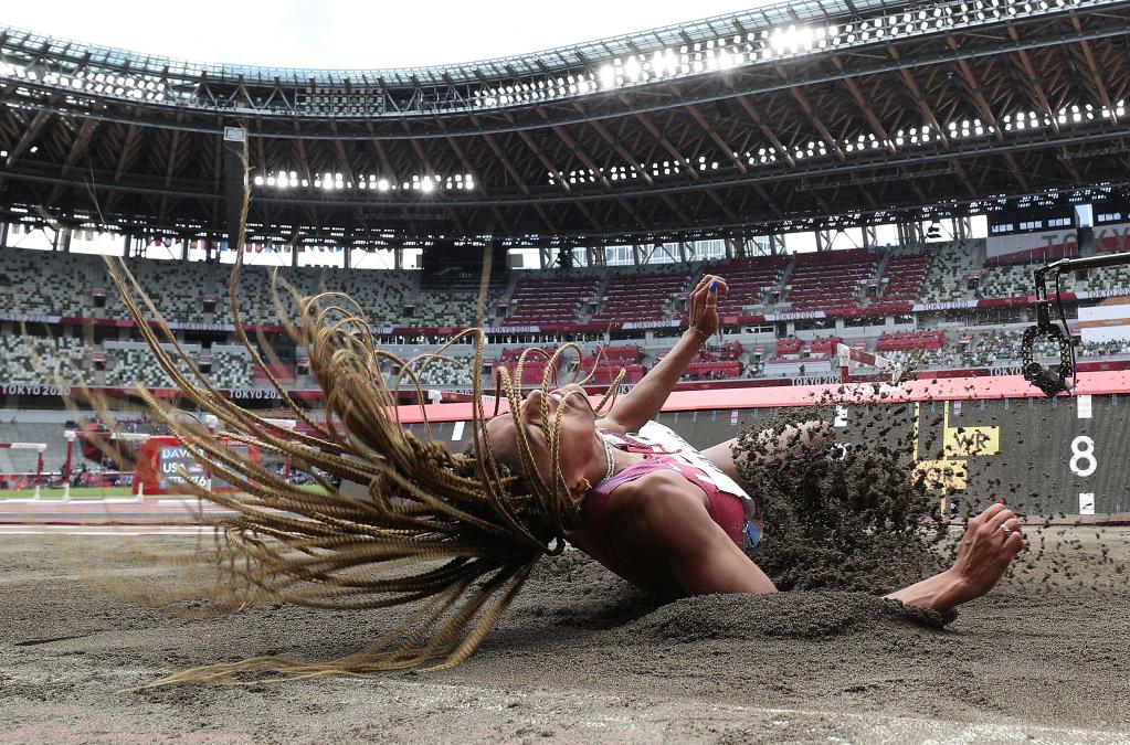 Tara Davis of the United States competes during the women's long jump final at Tokyo 2020 Olympic Games, in Tokyo, Japan, Aug. 3, 2021. (Xinhua/Li Ming)