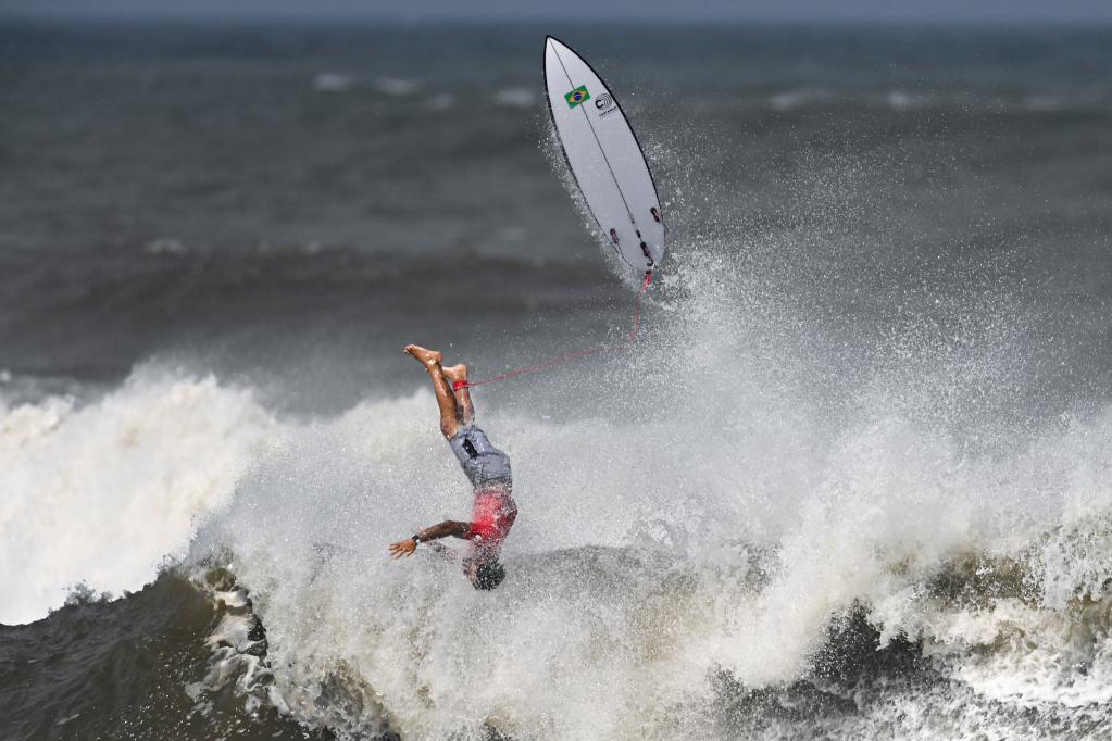 Gabriel Medina of Brazil crashes on a wave during the bronze medal heat of the men's surfing match of at the Tokyo 2020 Olympic Games at Tsurigasaki beach in Ichinomiya, Japan, July 27, 2021. (Xinhua/Du Yu)