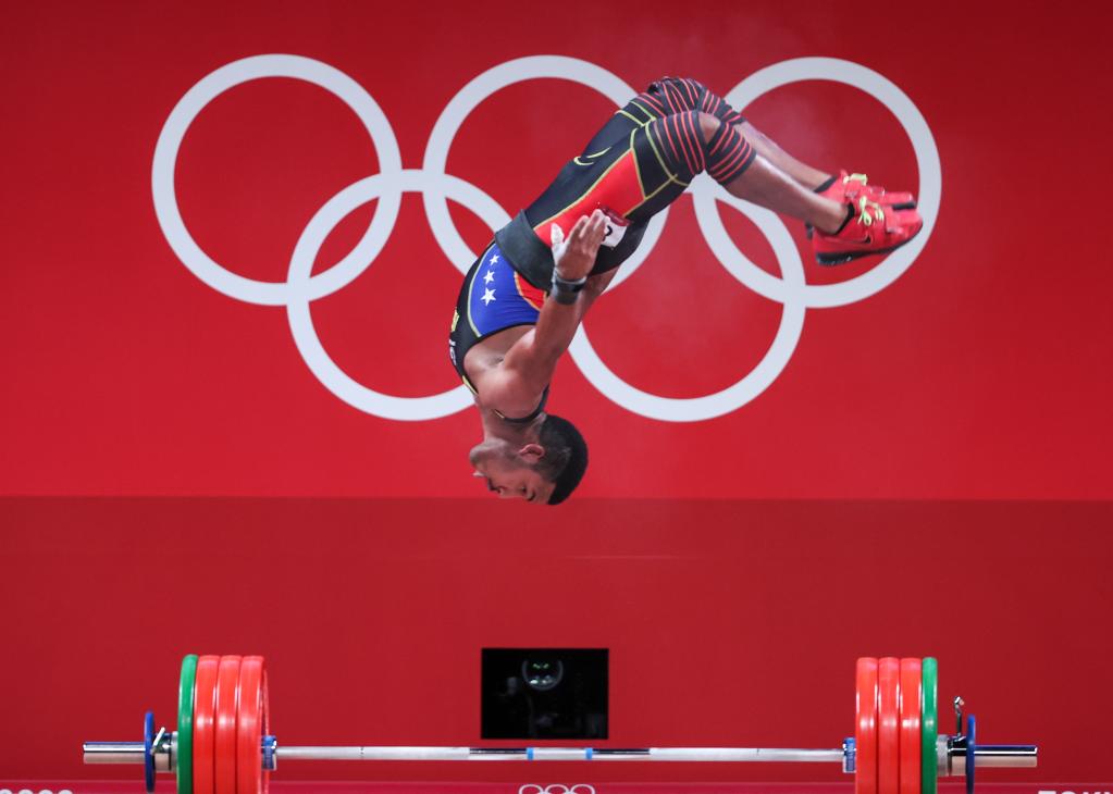 Julio Ruben Mayora Pernia of Venezuela somersaults during the men's 73kg weightlifting event of the Tokyo 2020 Olympic Games in Tokyo, Japan, July 28, 2021. (Xinhua/Yang Lei)