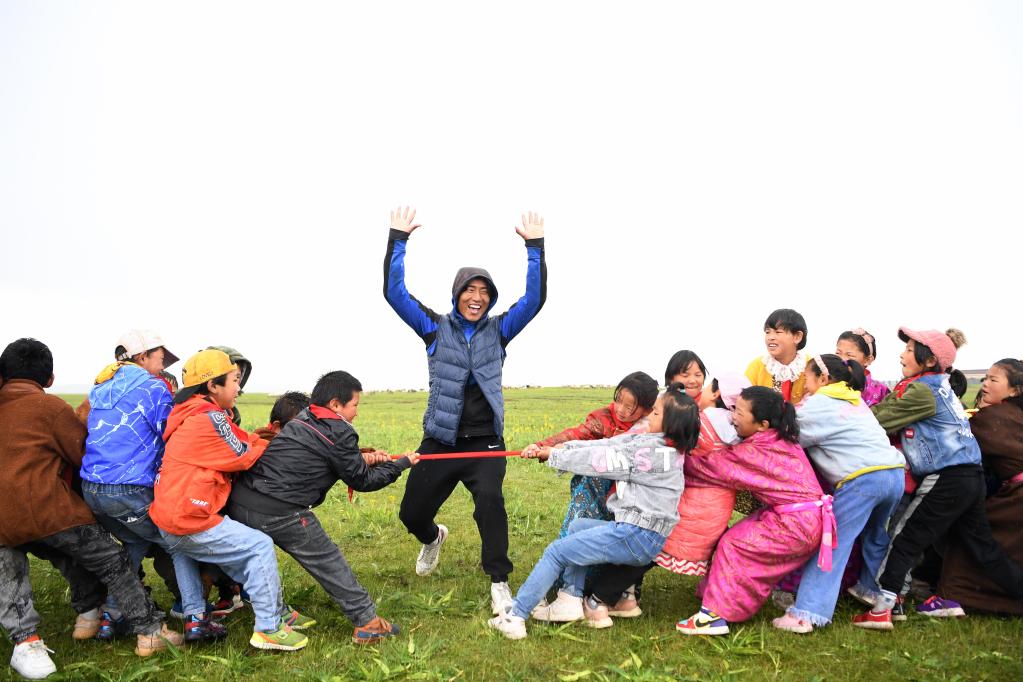 Children of Hequ Machang Primary School play tug-of-war as their teacher Daobudan (C) cheer for them during their summer vocation in Maqu County, Gannan Tibetan Autonomous Prefecture, northwest China's Gansu Province on July 14, 2021. (Xinhua/Chen Bin)