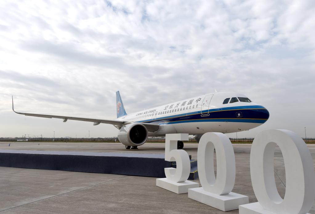 The 500th A320 aircraft assembled at the Airbus Final Assembly Line Asia (FALA) is pictured in Tianjin, north China, Oct. 29, 2020. (Photo by Zhao Zishuo/Xinhua)