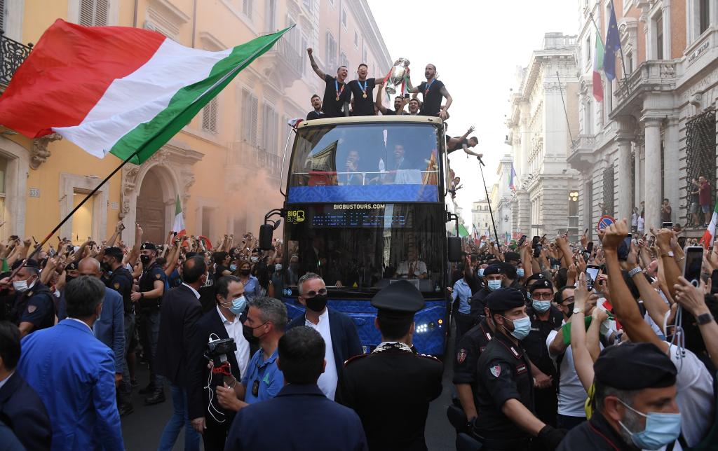 Players of Italy celebrate with fans in Rome, Italy, July 12, 2021. Italy won the final against England at the UEFA EURO 2020 in London on July 11. Italy beat England 3-2 in a penalty shootout after a 1-1 draw. (Photo by Alberto Lingria/Xinhua)