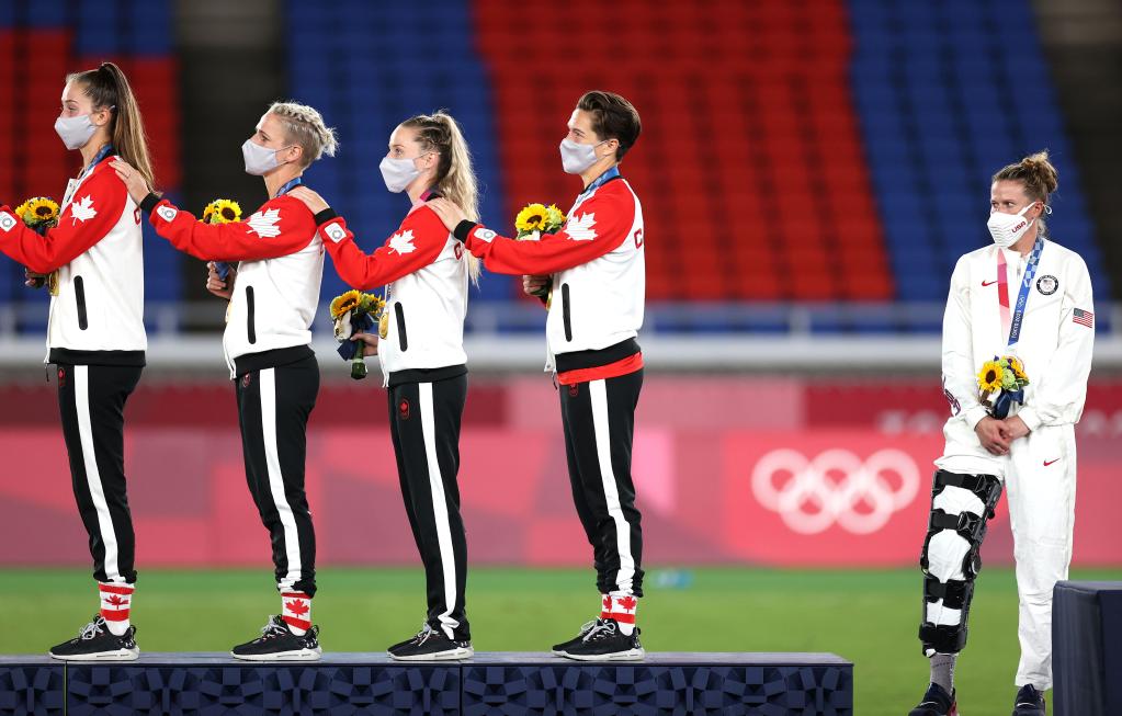 Alyssa Naeher (R), goalkeeper of team USA, looks on as players of team Canada listen to their national anthem on the podium during the awarding ceremony for women's football event at the Tokyo 2020 Olympic Games in Yokohama, Japan, Aug. 6, 2021. (Xinhua/Jia Haocheng)