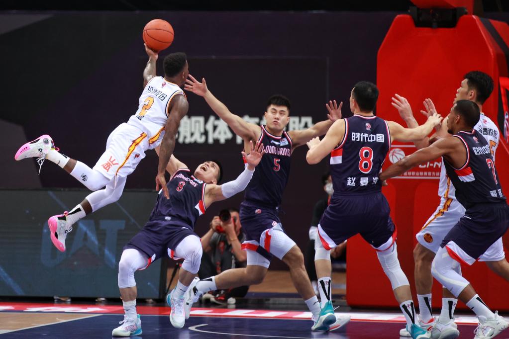 Kahlil Felder (L) of Shanxi Loongs breaks through during a match against Guangzhou Loong Lions at the 2021-2022 season of the Chinese Basketball Association (CBA) league in Zhuji, east China's Zhejiang Province, Oct. 19, 2021. (Xinhua/Liu Xu)
