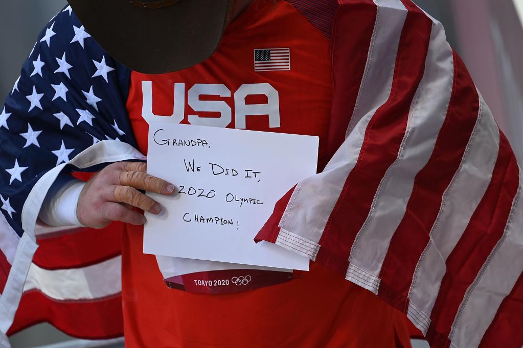 Ryan Crouser of the United States displays a message after winning the men's shot put final at Tokyo 2020 Olympic Games, in Tokyo, Japan, Aug. 5, 2021. (Xinhua/Li Yibo)