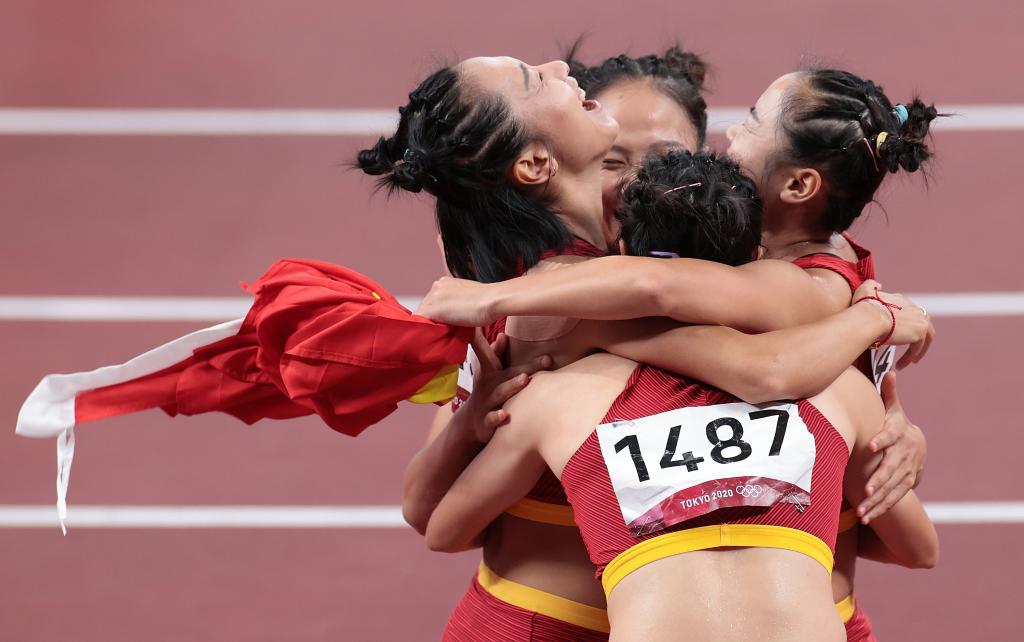 Team China celebrate after the women's 4x100m final at the Tokyo 2020 Olympic Games in Tokyo, Japan, Aug. 6, 2021. (Xinhua/Li Gang)