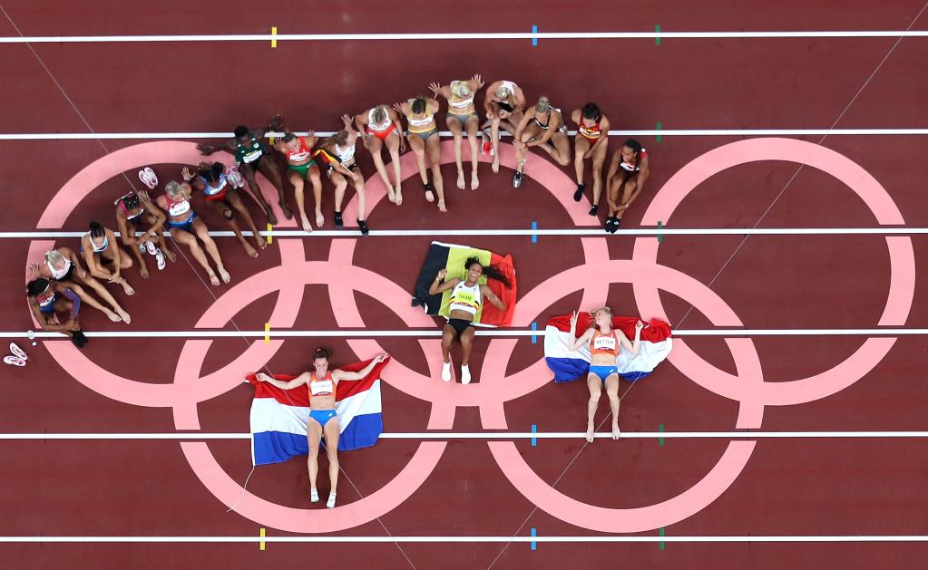 Athletes pose for a photo with the Olympic rings after the women's heptathlon at Tokyo 2020 Olympic Games, in Tokyo, Japan, Aug. 5, 2021. (Xinhua/Zhang Chuanqi)
