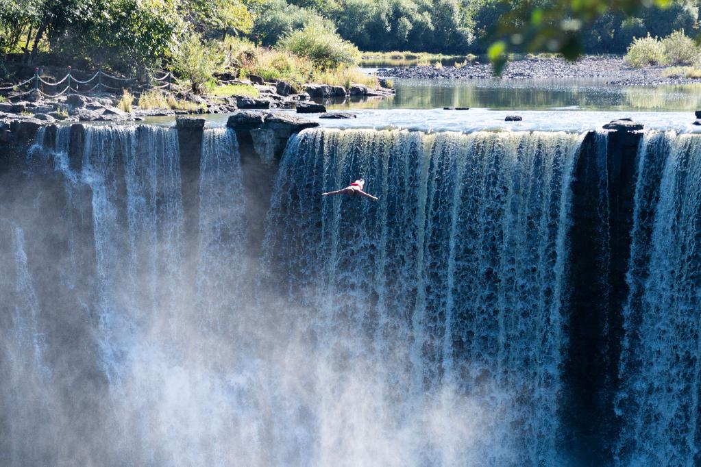 Di Huanran dives off a waterfall at Jingpo Lake, Heilongjiang Province of China, Dec. 23, 2021. Di first tried his hand at outdoor diving at this waterfall in 1983. Now the 62-year-old man regards waterfall dive as his lifelong pursuit. (Xinhua/Xie Jianfei)