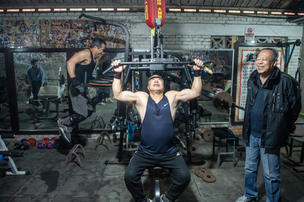 Body builders chat as they exercise at the "Shed Gym" in Beijing, China on March 10, 2021. Situated in the residential area of the CRRC Beijing Locomotive Company, the "Shed Gym" transformed from a bicycle shed has attracted its neighbours for more then 30 years. It is maintained by local body builders and now opens freely for students and elders. (Xinhua/Peng Ziyang)