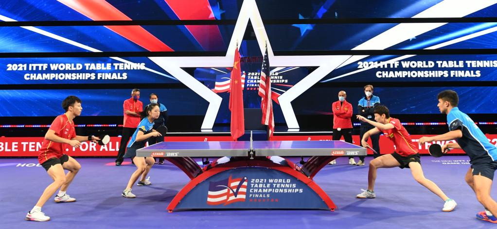 Lin Gaoyuan (1st L, front) of China, Lily Zhang (2nd L, front) of the United States compete with Wang Manyu (2nd R, front) of China and Kanak Jha (1st R, front) of the United States during a joint training session of two pairs formed of both American and Chinese players entering the mixed doubles competition at the 2021 World Table Tennis Championships in Houston, the United States, on Nov. 22, 2021. (Xinhua/Wu Xiaoling)