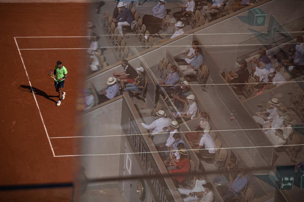 Rafael Nadal of Spain competes during the men's singles quarterfinal against Diego Schwartzman of Argentina at the French Open tennis tournament at Roland Garros in Paris, France, June 9, 2021. (Photo by Aurelien Morissard/Xinhua)