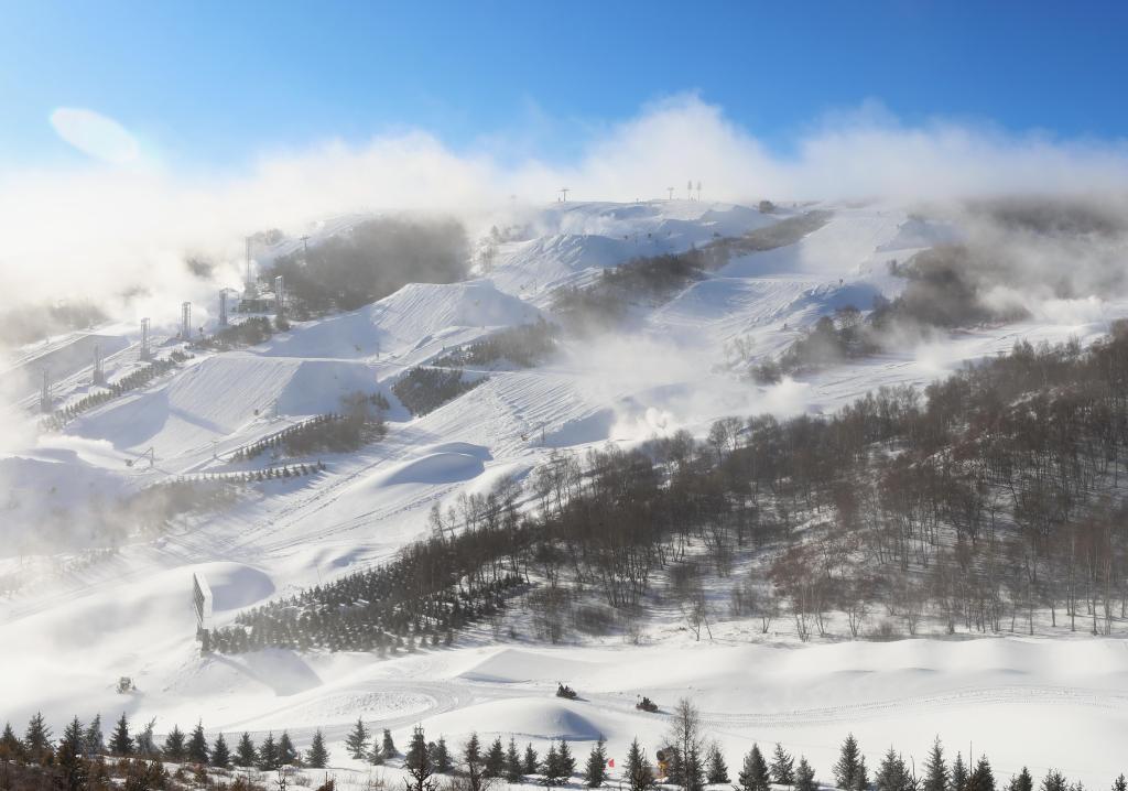 Photo taken on Dec. 17, 2021 shows a view of Yunding Ski Resort in Chongli of Zhangjiakou City, north China's Hebei Province. The staff of Yunding Ski Resort in Zhangjiakou competition zone are busy preparing the tracks for the upcoming Beijing 2022 Olympic Winter Games. (Xinhua/Yang Shiyao)