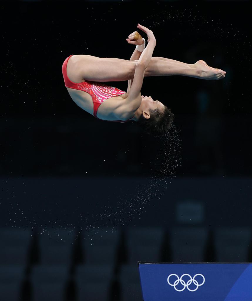Quan Hongchan of China competes during the women's 10m platform final of diving at the Tokyo 2020 Olympic Games in Tokyo, Japan, Aug. 5, 2021. The14-year-old Chinese diver Quan Hongchan snatched the women's 10m platform gold at the Tokyo 2020 Olympic Games with the highest score in history. (Xinhua/Ding Xu)
