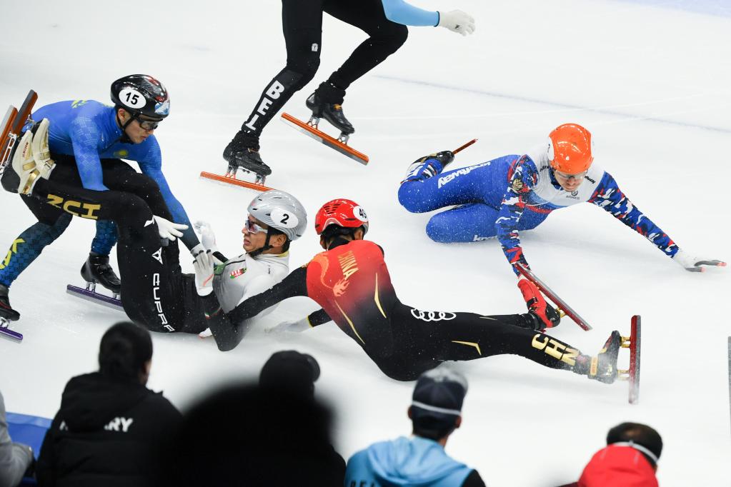 Athletes clash with each other during the men's 1500m final at ISU World Cup Short Track 2021/2022 in Beijing, capital of China, Oct. 23, 2021. (Xinhua/Ju Huanzong)