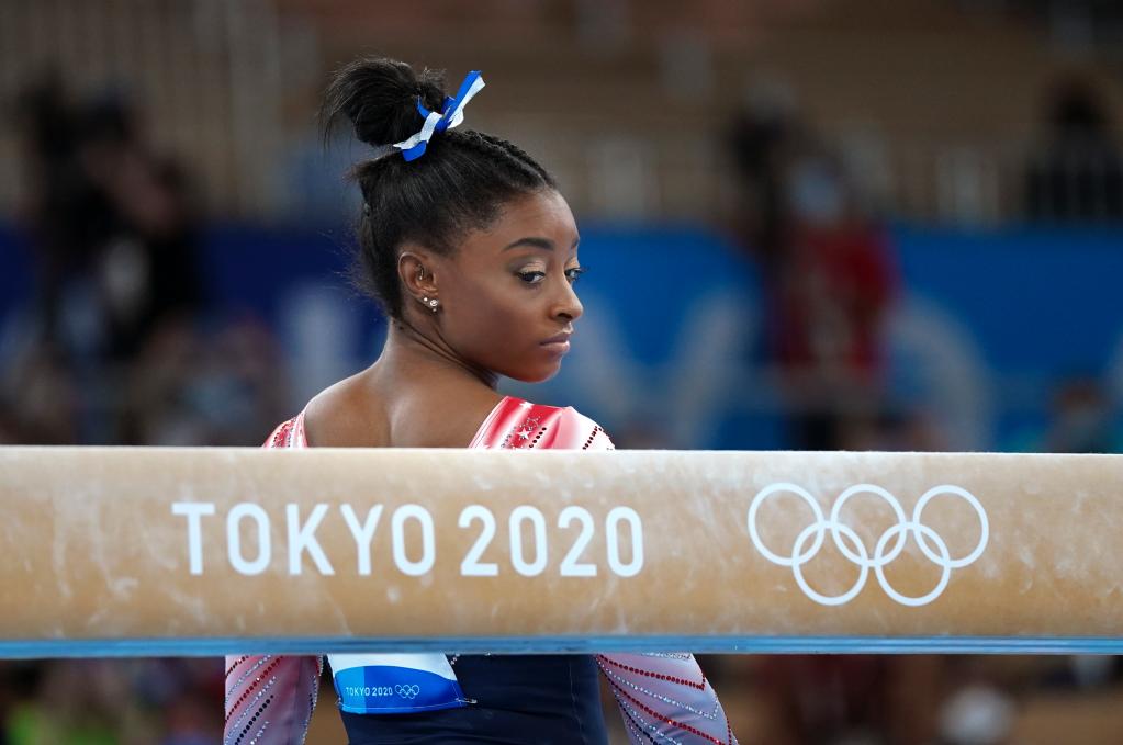Simone Biles of the United States is seen before the artistic gymnastics women's balance beam final at the Tokyo 2020 Olympic Games in Tokyo, Japan, Aug. 3, 2021. (Xinhua/Cheng Min)