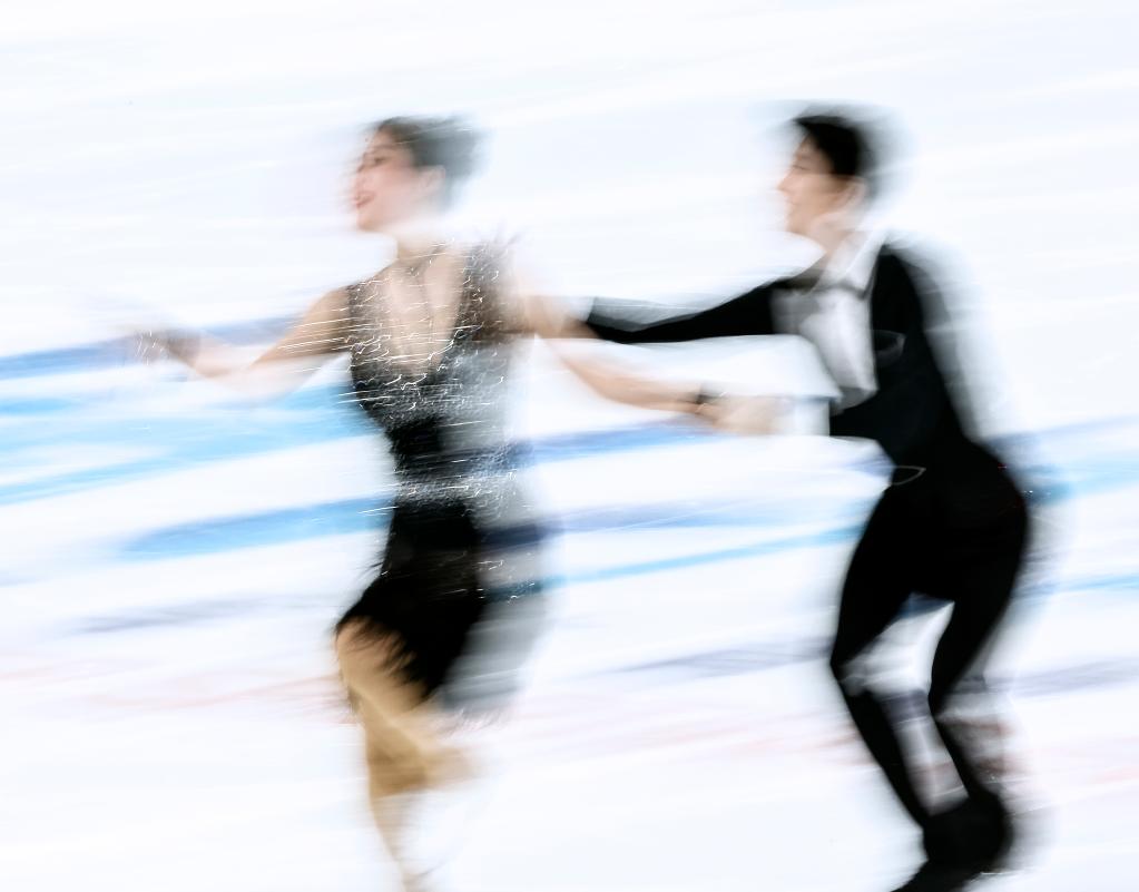 Figure skaters perform during the Ice Dance Rhythm Dance at the Experience Beijing figure skating test event in Beijing, China on April 6, 2021. (Xinhua/Lan Hongguang)