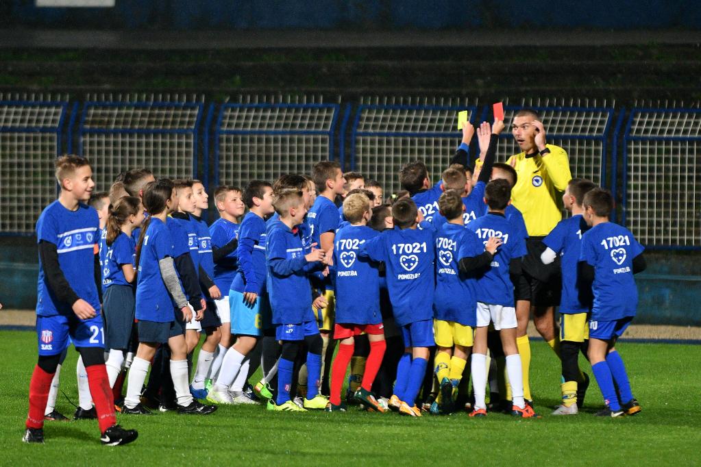 Children show cards to the referee after a charity football match between 11 professional players of the football Club Zeljeznicar from Sarajevo and 100 children in Sarajevo, Bosnia and Herzegovina (BiH), Oct. 10, 2021. (Xinhua/Nedim Grabovica)