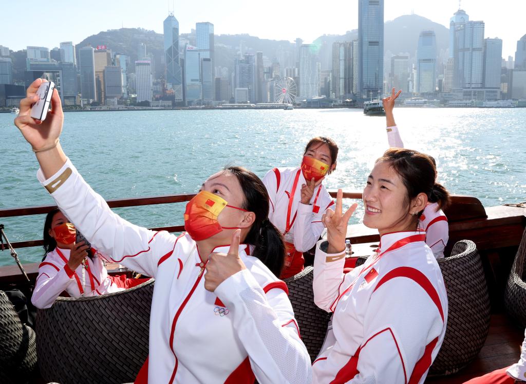 Chinese mainland Olympians take selfies on a yacht at Hong Kong's Victoria Harbor during their visit to the Hong Kong Special Administrative Region (HKSAR), China, Dec. 4, 2021. (Xinhua/Jia Haocheng)
