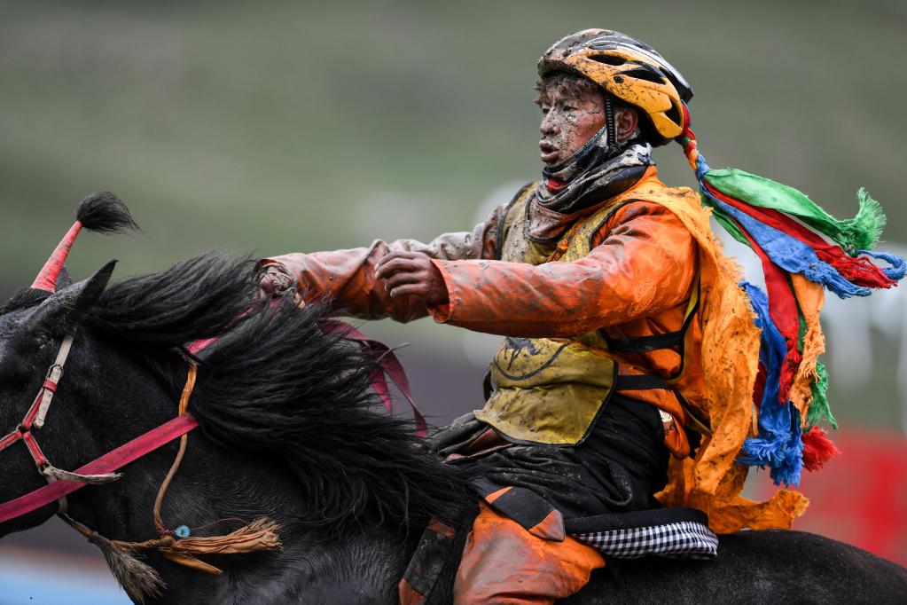 A man rides his horse during a horse race to celebrate the 70th anniversary of the founding of Yushu Tibetan Autonomous Prefecture in Yushu, northwest China's Qinghai Province, Aug. 6, 2021. (Xinhua/Wu Gang)