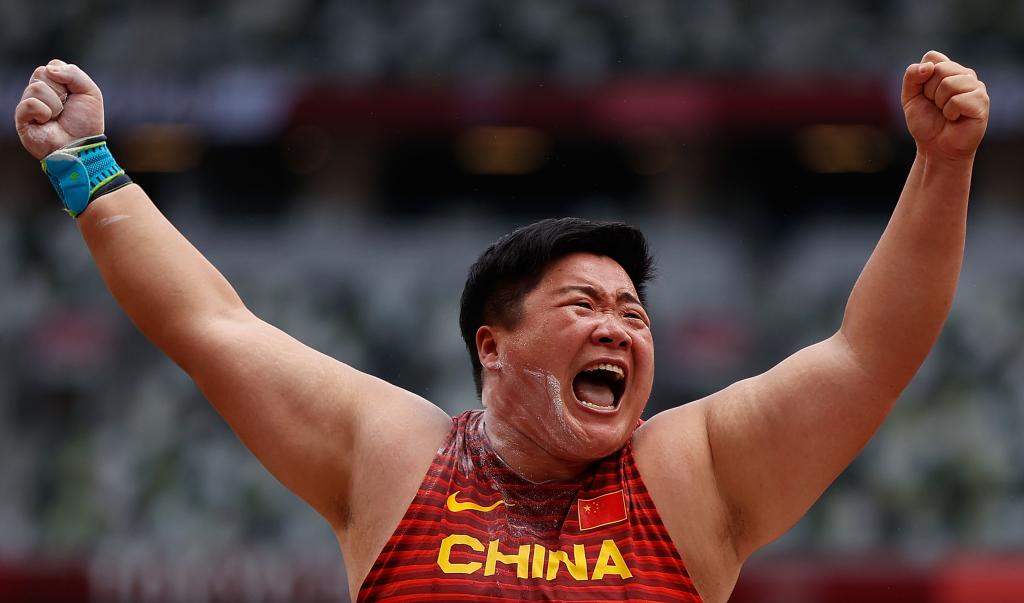 Gong Lijiao of China celebrates during the women's shot put final at Tokyo 2020 Olympic Games, in Tokyo, Japan, Aug. 1, 2021. (Xinhua/Wang Lili)