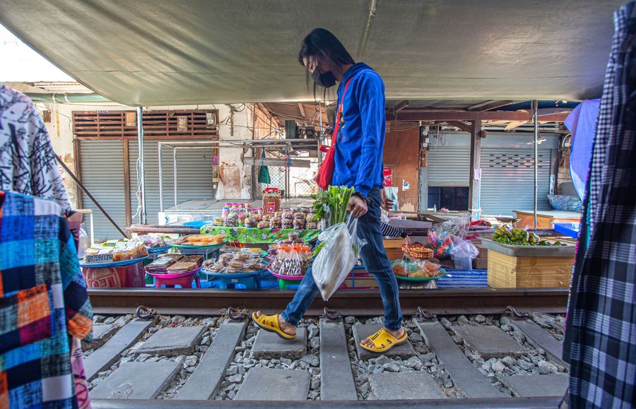 A customer is seen at Maeklong Railway Market in Samut Songkhram Province, Thailand, on Jan. 5, 2022. (Xinhua/Wang Teng)