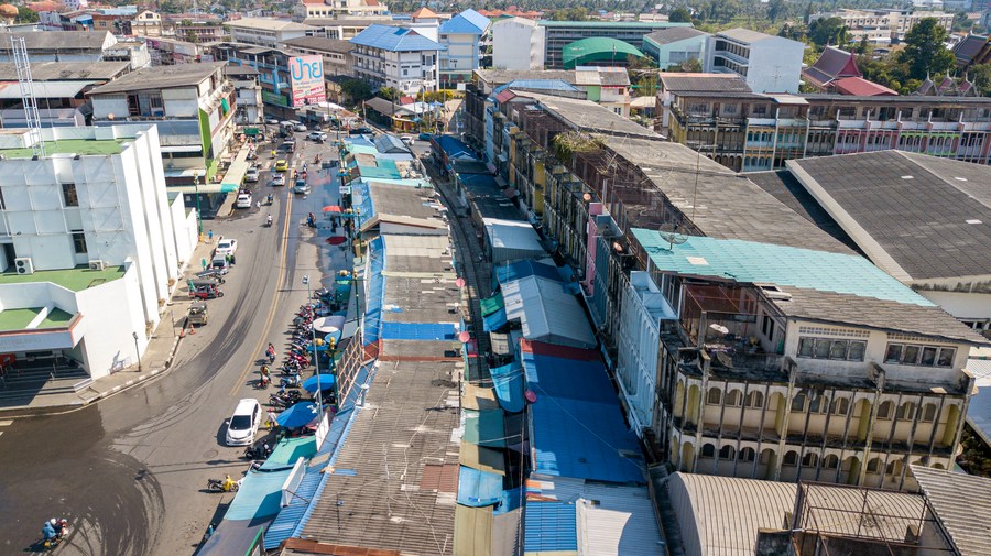 Aerial photo taken on Jan. 5, 2022 shows the Maeklong Railway Market in Samut Songkhram Province, Thailand. (Xinhua/Wang Teng)■