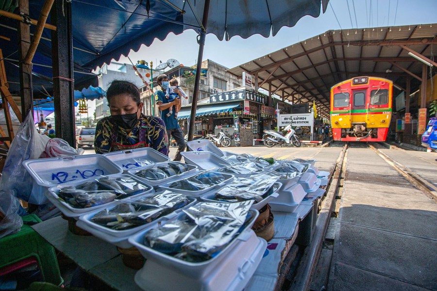 A vendor is seen at Maeklong Railway Market in Samut Songkhram Province, Thailand, Jan. 5, 2022. (Xinhua/Wang Teng)