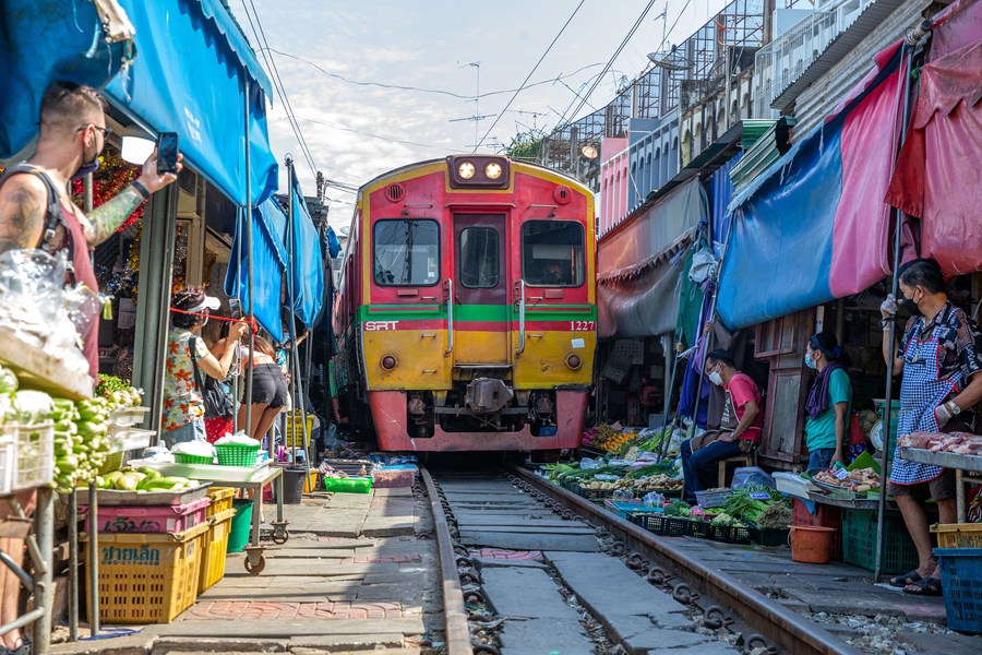 A commuter train runs through Maeklong Railway Market in Samut Songkhram Province, Thailand, Jan. 5, 2022. (Xinhua/Wang Teng)