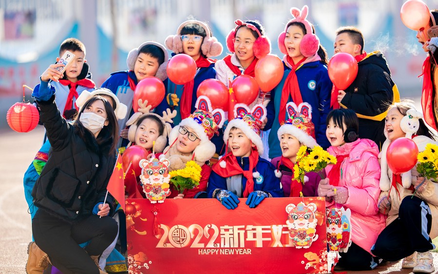 Students take a selfie with their teacher to celebrate the New Year at an elementary school in Hohhot, north China's Inner Mongolia Autonomous Region, Dec. 31, 2021. (Photo by Ding Genhou/Xinhua)