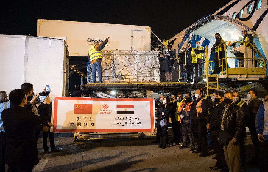 Workers convey a batch of Sinopharm COVID-19 vaccines donated by China at Cairo International Airport, Egypt, Feb. 23, 2021. (Xinhua/Wu Huiwo)