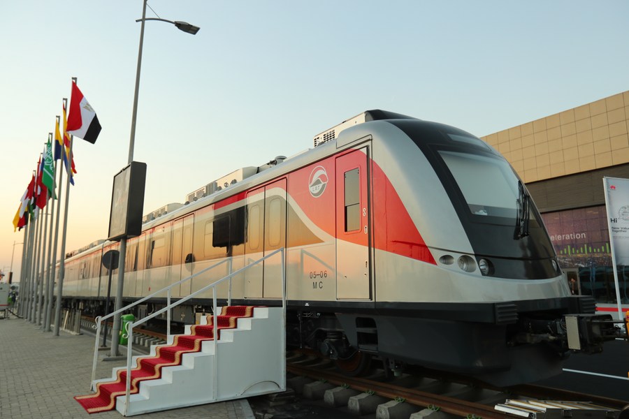 A real four-coach train is displayed by the China Railway Rolling Stock Corporation (CRRC) during the fourth Smart Transportation and Logistics Fair and Forum for the Middle East and Africa (TransMEA 2021) in Cairo, Egypt, Nov. 7, 2021. (Xinhua/Sui Xiankai)