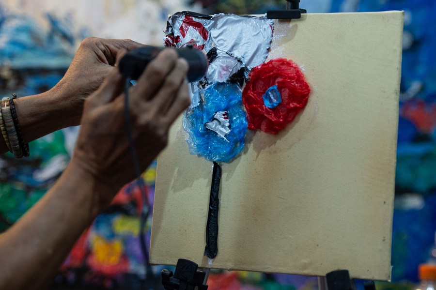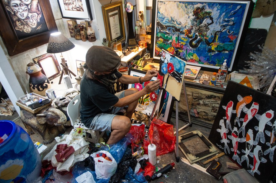 Dwiyono demonstrates making paintings from plastic waste in his workshop in Jakarta on Jan. 6, 2022. (Xinhua/Veri Sanovri)