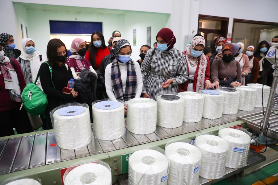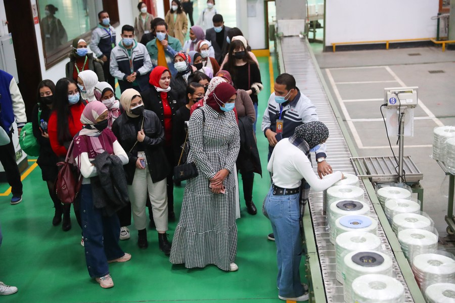 Egyptian students visit China's fiberglass giant manufacturer Jushi in Suez Province, Egypt, on Dec. 30, 2021. (Xinhua/Sui Xiankai)