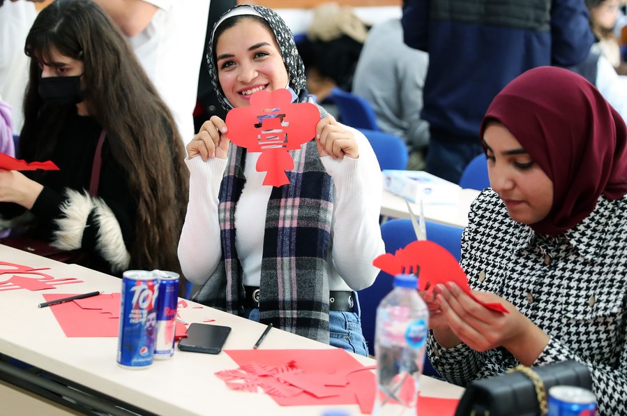 Egyptian students experience traditional Chinese paper cutting at China's fiberglass giant manufacturer Jushi in Egypt, on Dec. 30, 2021. (Xinhua/Wang Dongzhen)