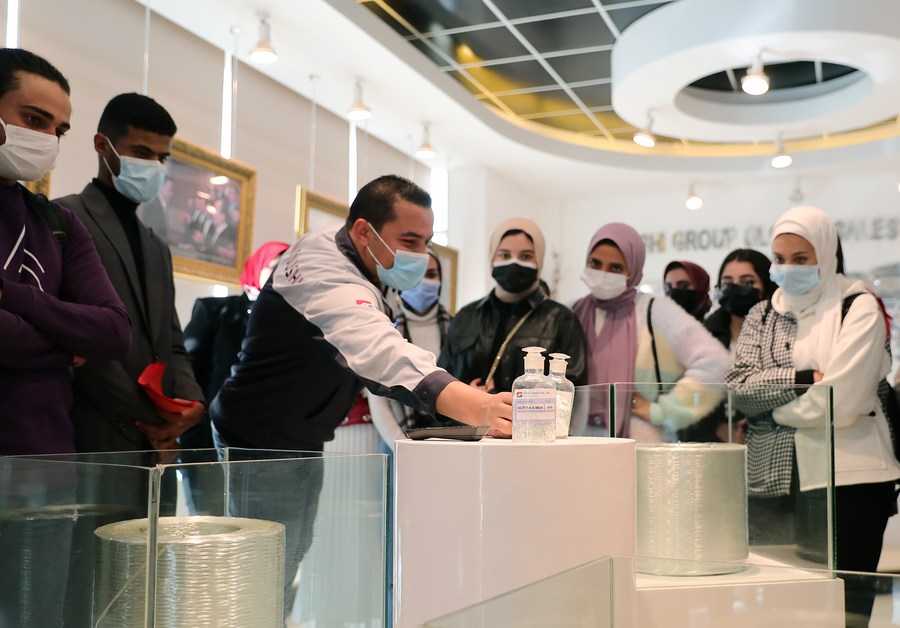 Egyptian students visit the exhibition hall of China's fiberglass giant manufacturer Jushi in Suez Province, Egypt, on Dec. 30, 2021. (Xinhua/Wang Dongzhen)