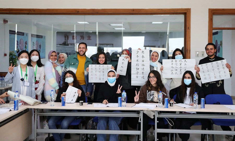 Egyptian students experience traditional Chinese calligraphy at China's fiberglass giant manufacturer Jushi, on Dec. 30, 2021. (Xinhua/Wang Dongzhen)