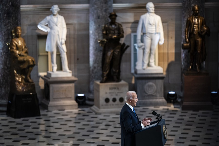 Video: "One year ago today, in this sacred place, democracy was attacked, simply attacked." U.S. President Joe Biden delivered a speech from Statuary Hall just outside the House chamber, Washington, D.C., the United States, on Jan. 6, 2022, to reflect on the "darkest day" for the country and the "fragility of democracy." (Xinhua)