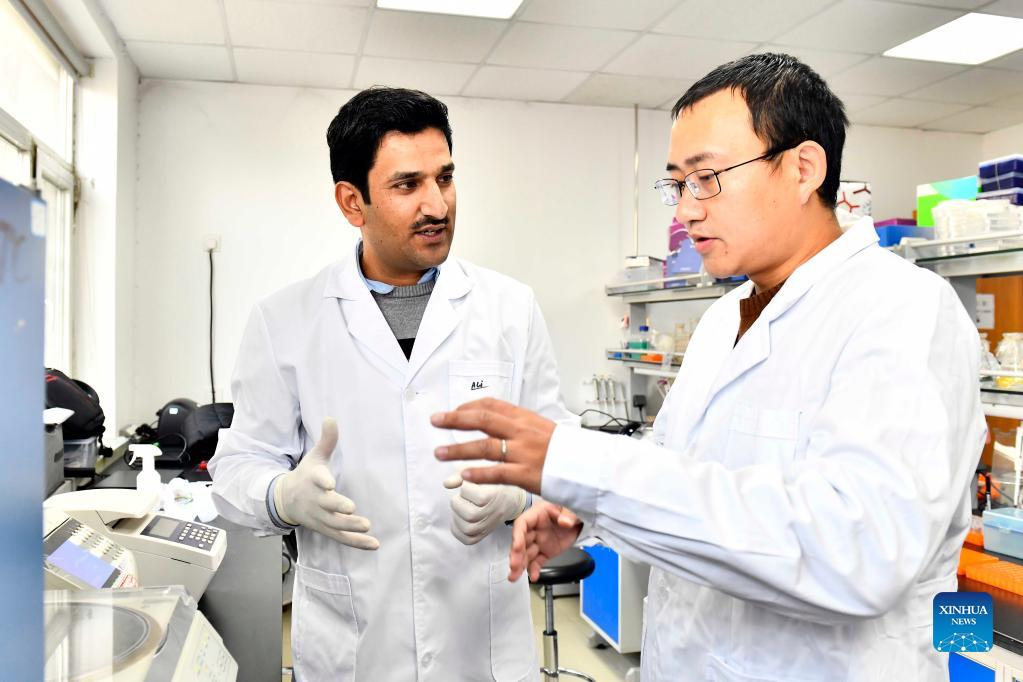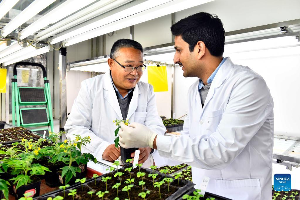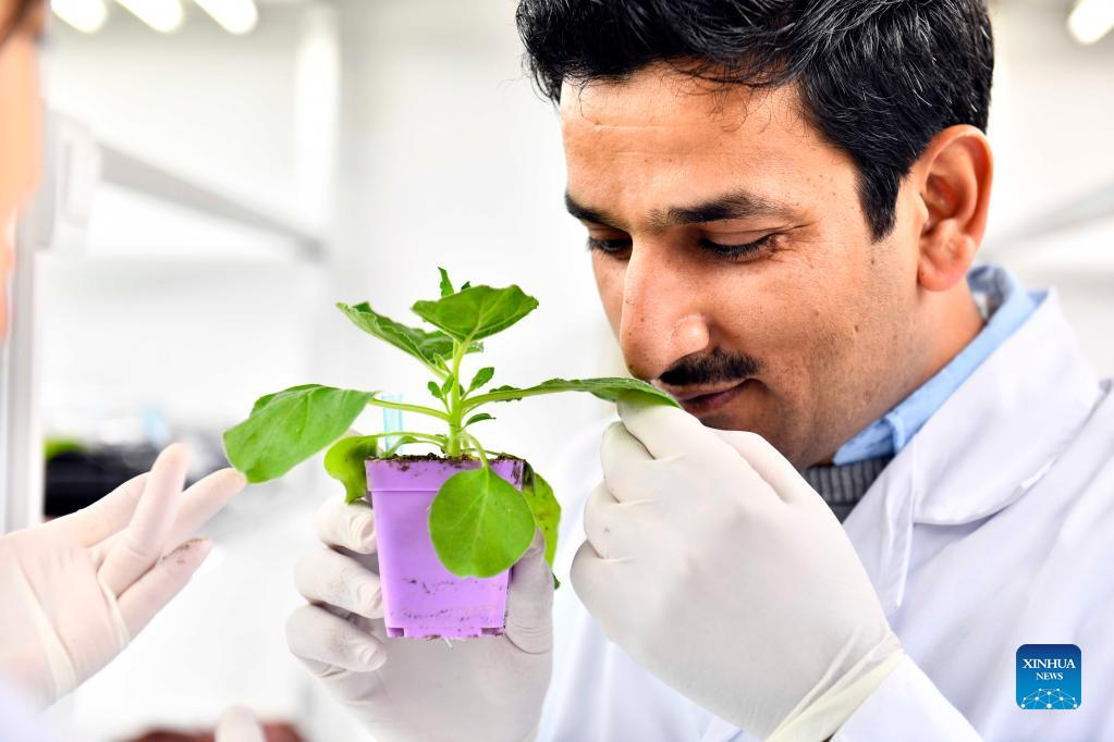 Dr. Anwar Ali (R) studies in the tissue culture lab with his tutor Gao Jianwei at the Institute of Vegetables and Flowers of Shandong Academy of Agricultural Sciences in Jinan, east China's Shandong Province, Jan. 7, 2022. In 2016, Ali, a Pakistani student at that time, came to China and got his doctor's degree at the Institute of Vegetables and Flowers of Chinese Academy of Agricultural Sciences. In 2021, he came to Jinan for further study, conducting his post-doctoral research here. "Shandong is a major agricultural province in China, which also has the edge on agricultural technology," said Ali. He hopes to bring the advanced vegetable planting technology he has learned here back to Pakistan to help develop the agricultural industry of his homeland. Ali is glad that he can witness and disseminate China-Pakistan friendship with vegetable sciences. (Xinhua/Guo Xulei)