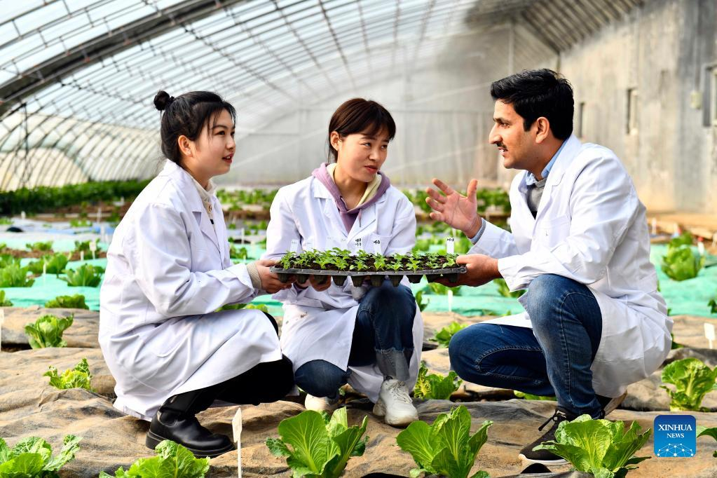 Dr. Anwar Ali (L) talks with a researcher at the Institute of Vegetables and Flowers of Shandong Academy of Agricultural Sciences in Jinan, east China's Shandong Province, Jan. 7, 2022. In 2016, Ali, a Pakistani student at that time, came to China and got his doctor's degree at the Institute of Vegetables and Flowers of Chinese Academy of Agricultural Sciences. In 2021, he came to Jinan for further study, conducting his post-doctoral research here. "Shandong is a major agricultural province in China, which also has the edge on agricultural technology," said Ali. He hopes to bring the advanced vegetable planting technology he has learned here back to Pakistan to help develop the agricultural industry of his homeland. Ali is glad that he can witness and disseminate China-Pakistan friendship with vegetable sciences. (Xinhua/Guo Xulei)
