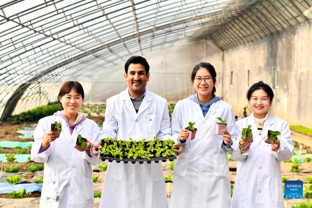 Dr. Anwar Ali (1st R) talks with researchers at the Institute of Vegetables and Flowers of Shandong Academy of Agricultural Sciences in Jinan, east China's Shandong Province, Jan. 7, 2022. In 2016, Ali, a Pakistani student at that time, came to China and got his doctor's degree at the Institute of Vegetables and Flowers of Chinese Academy of Agricultural Sciences. In 2021, he came to Jinan for further study, conducting his post-doctoral research here. "Shandong is a major agricultural province in China, which also has the edge on agricultural technology," said Ali. He hopes to bring the advanced vegetable planting technology he has learned here back to Pakistan to help develop the agricultural industry of his homeland. Ali is glad that he can witness and disseminate China-Pakistan friendship with vegetable sciences. (Xinhua/Guo Xulei)