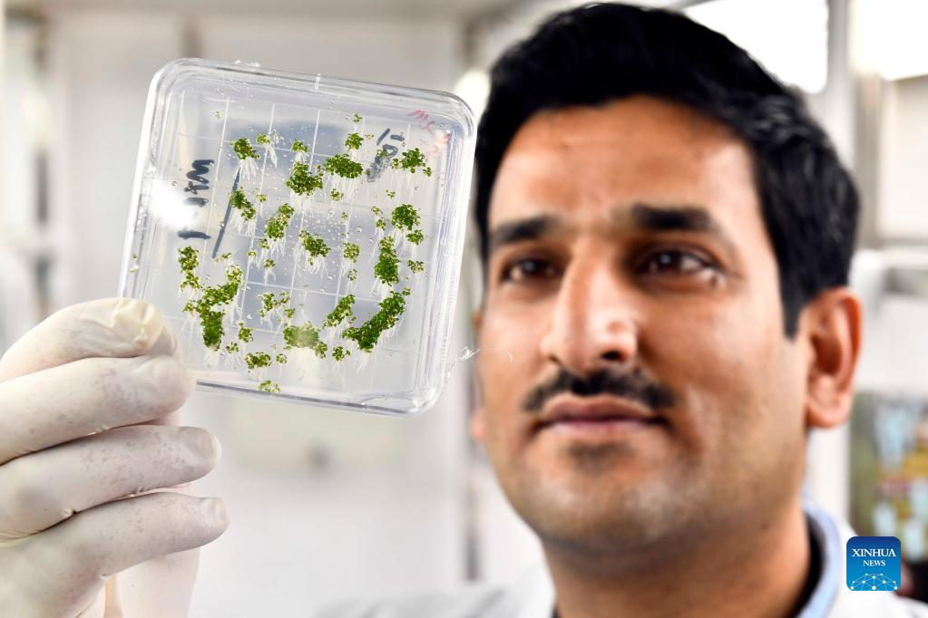 Dr. Anwar Ali ckecks the growth of tissue culture vegetable he cultivated at the Institute of Vegetables and Flowers of Shandong Academy of Agricultural Sciences in Jinan, east China's Shandong Province, Jan. 7, 2022. In 2016, Ali, a Pakistani student at that time, came to China and got his doctor's degree at the Institute of Vegetables and Flowers of Chinese Academy of Agricultural Sciences. In 2021, he came to Jinan for further study, conducting his post-doctoral research here. "Shandong is a major agricultural province in China, which also has the edge on agricultural technology," said Ali. He hopes to bring the advanced vegetable planting technology he has learned here back to Pakistan to help develop the agricultural industry of his homeland. Ali is glad that he can witness and disseminate China-Pakistan friendship with vegetable sciences. (Xinhua/Guo Xulei)