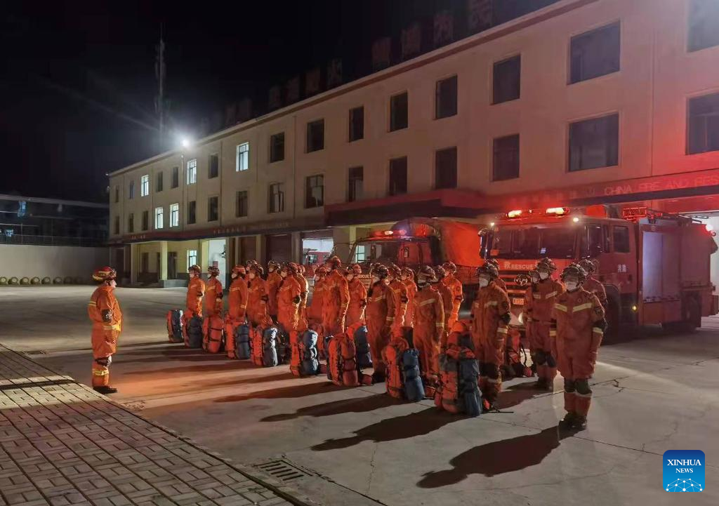 Fire fighters rally for rescue in Xining, northwest China's Qinghai Province, Jan. 8, 2022. A 6.9-magnitude earthquake jolted Menyuan County in northwest China's Qinghai Province at 1:45 a.m. Saturday, according to the China Earthquake Networks Center (CENC).
