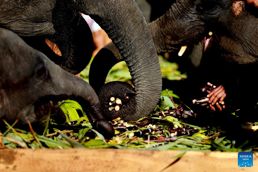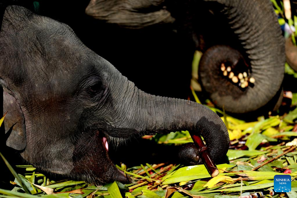Elephants eat fruit and vegetables at the Wingabaw Elephant Camp in Bago region, Myanmar, on Jan. 7, 2022. (Xinhua/U Aung)