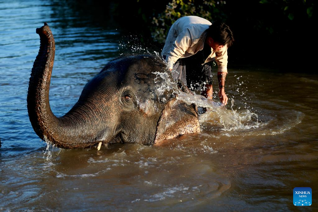 An elephant keeper helps an elephant bathe at the Wingabaw Elephant Camp in Bago region, Myanmar, on Jan. 7, 2022. (Xinhua/U Aung)