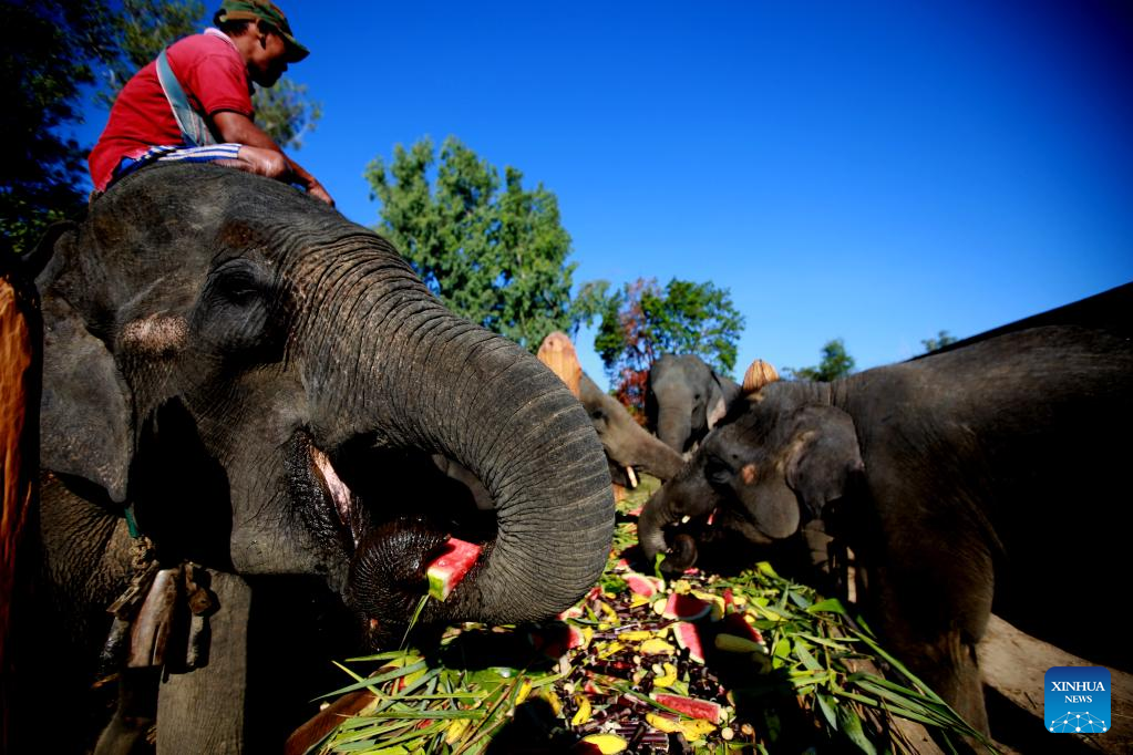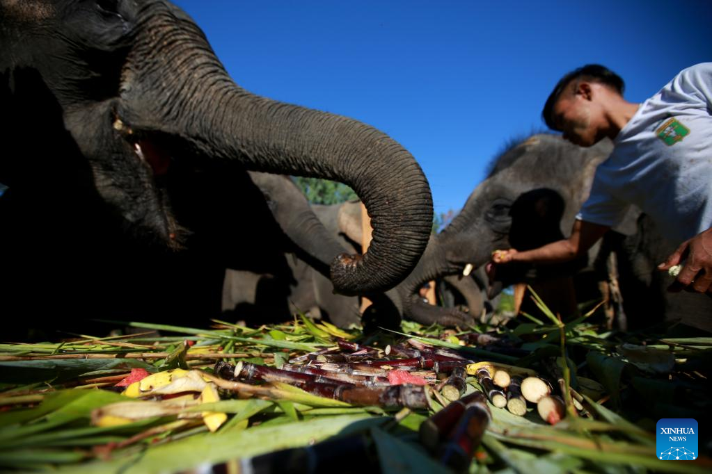 An elephant keeper feeds elephants with various kinds of fruit and vegetables at the Wingabaw Elephant Camp in Bago region, Myanmar, on Jan. 7, 2022. (Xinhua/U Aung)
