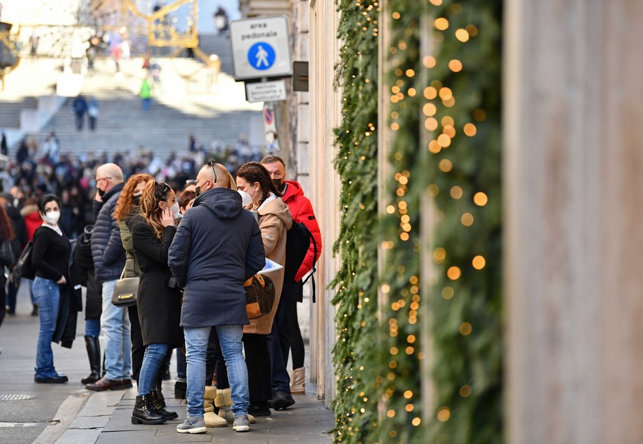 People wait to enter a store on Via dei Condotti shopping street in Rome, Italy, on Dec.19, 2021. (Xinhua/Jin Mamengni)