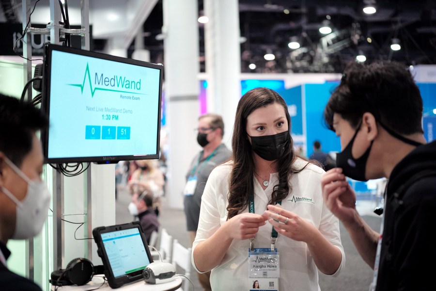 An exhibitor introduces health technologies to a visitor during the 2022 Consumer Electronics Show (CES) in Las Vegas, the United States, Jan. 6, 2022. (Xinhua/Wu Xiaoling)