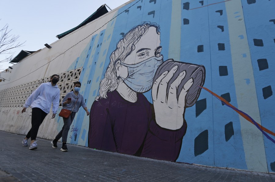 People wearing face masks walk past a mural in Beirut, Lebanon, on Jan. 7, 2022. (Xinhua/Bilal Jawich)